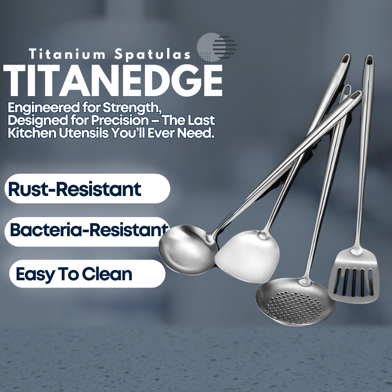 Discover the power of TitanEdge Titanium Spatulas—crafted for precision and built to last. With rust-resistant titanium, a bacteria-free surface, and effortless cleaning, these utensils elevate your cooking experience while ensuring your kitchen stays safe and hygienic. Designed for home chefs and professionals alike, they are the only kitchen tools you'll ever need.